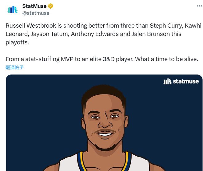美媒StatMuse在推特上盛赞威少的完美转型:“拉塞尔·威斯布鲁克的三分球命中率在本季季后赛中超过了库里、莱昂纳德、塔图姆、爱德华兹和布伦森。从一位数据爆表的MVP到一位顶尖的三分球手。真是个活在当下的好时代!”