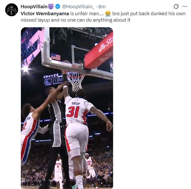 这场比赛文班亚马又打出了炸裂的表现,在一次挑篮没有命中后,他面对两人直接补扣成功,文班亚马这个身体天赋实在是太强悍了。首节6中4+三分3中2拿到12分3篮板3盖帽。